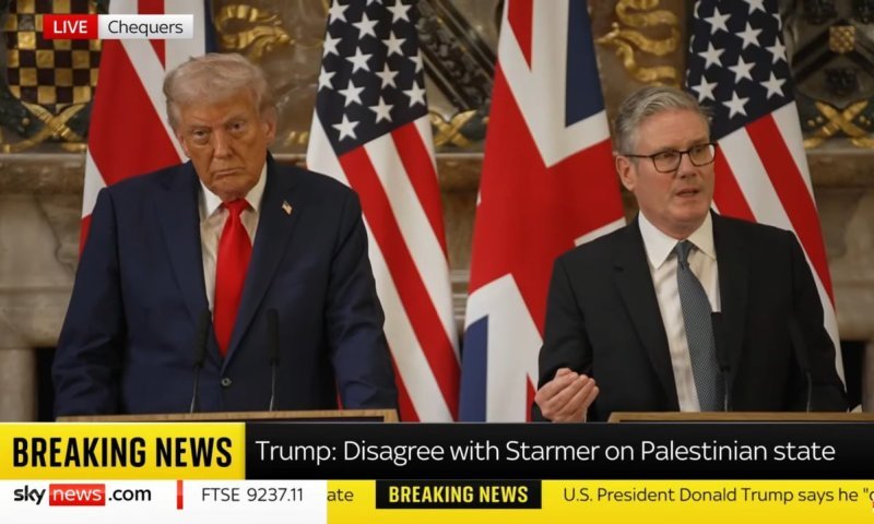 על רקע החלטת ממשלת בריטניה להכיר בסוף השבוע הקרוב במדינה פלסטינית, נשיא ארה"ב דונלד טראמפ אמר לצד קיר סטרמר במסיבת עיתונאים שקיימו היום כי "אני לא מסכים איתו בסוגיה הזו"