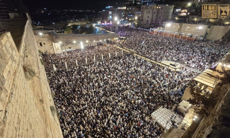 שורדת השבי אמילי דמארי השתתפה הלילה במעמד המרכזי של הסליחות ברחבת הכותל המערבי • למעלה מ- 50 אלף מתפללים השתתפו הלילה במעמד הסליחות המרכזי ברחבת הכותל המערבי • המעמד הועבר בשידור חי על מסכי ענק בפאתי רחבת הכותל ועל גבי חומות שער יפו בכניסה לעיר העתיקה