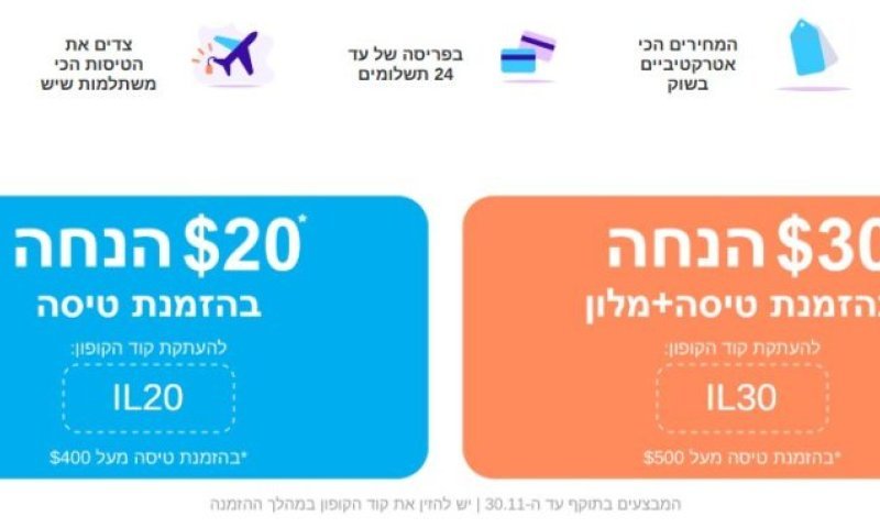 30 דולר הנחה בהזמנת חבילת טיסה + מלון