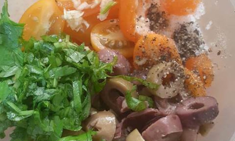 מתכון לסלט זיתים עם עגבניות שרי וירק קצוץ